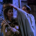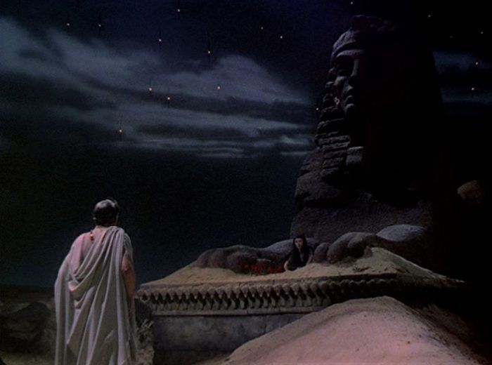 Tra la Cleopatra di DeMille, con Claudette Colbert (1934), e la Cleopatra più famosa della storia del cinema, quella di Mankiewicz con Liz Taylor (1963), il volto della regina d'Egitto assunse le sembianze anche di Vivien Liegh, già affermatasi per quel Via Col Vento interpretato nel 1939, La genesi del film derivava nientemeno che dall'opera teatrale di George Bernard Shaw, che curò soggetto e sceneggiatura del film diretto da Gabriel Pascal, misterioso produttore cinematografico sul quale andrebbe speso un intero capitolo a parte. Non esistendo documenti che lo riguardano anteriori ai suoi 17 anni, si pensa che si dette da solo il nome; di se stesso diceva di essere stato allevato dagli zingari, viaggio moltissimo e strinse amicizia con Shaw in un modo rocambolesco. La collaborazione tra i due fruttò alcune pellicole, due delle quali dirette da Pascal stesse (le sue uniche dure prove come regista). L'ultima in ordine di tempo fu Cesare E Cleopatra, prodotta con un dispiego di mezzi economici maestoso, tant'è che si guadagnò la nomea di film a colori (in technicolor) più costoso mai realizzato negli studio britannici Denham, nel Buckinghamshire. La stessa presenza della Leigh nel cast ebbe un impatto notevole sui costi, anche se questo comportava di contro una pubblicità ed un richiamo altrettanto importanti per la pellicola. Si girò sotto i bombardamenti e a causa di questa situazione estrema la Leigh abortì una gravidanza (all'epoca era sposata con Laurence Olivier), finendo in depressione e bloccando le riprese per cinque settimane. Il film uscì nel dicembre del '45 e fu un modesto successo di pubblico senza riuscire a coprire i costi di produzione che si tradussero in una perdita stimata sui 3 milioni di dollari, anche per via di qualche scelta un po' megalomane, tipo far arrivare vera sabbia dall'Egitto per il set. L'impianto è evidentemente teatrale, tanto nelle scenografie (che comunque mescolano fondali cartonati a riprese esterne piuttosto magniloquenti), quanto nello spazio scenico che materialmente occupano gli attori; l'impressione è proprio quella di un teatro espanso, in modo lussuosissimo e generoso, ma pur sempre teatro. Tutto ciò non toglie fascino alla pellicola ma semmai ne aggiunge (soprattutto con la spezia esotica derivante dai 75 anni trascorsi sin qui).