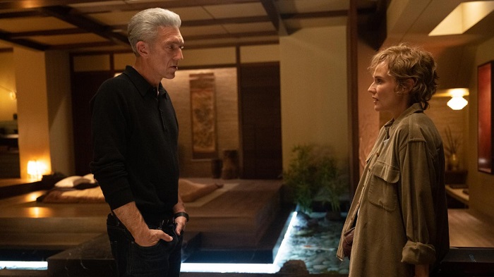 The Shrouds è un denso e gigantesco incubo nero pece, nel quale la trama a tratti si fa paradossale e grottesca, quasi girando vorticosamente attorno allo spettatore, il quale viene sfidato a seguirla su territori accidentati e non sempre solidi e concreti. Ma l'impressione è che Cronenberg ne sia del tutto consapevole e non se ne faccia alcun cruccio perché il fuoco di The Shrouds risiede altrove, in quel sentimento macabro che dai personaggi deve travasarsi nel pubblico, pervadendolo follemente allo stesso modo. Una giostra sulla quale bisogna accettare di salire cedendo alla sospensione dell'incredulità mentre i fotogrammi ci portano in mare aperto. Cronenberg ha raccontato che c'è molto di autobiografico in quanto viene rappresentato, il che aggiunge estremismo ad estremismo. Come Karsh (che ha praticamente le fattezze di Cronenberg stesso), anche lui ha perso la moglie dopo oltre 40 anni di unione sentimentale e professionale. Le immagini sono affascinanti, la capacità narrativa è innegabile, agitata da una violenza concettuale e al contempo da un'asciuttezza della messa in scena nelle quali si riconoscono la firma di Cronenberg. The Shrouds è la sua personale elaborazione del lutto, la sua via d'uscita dal dramma, alla maniera di Cronenberg quindi nella più totale iconoclastia. A Thanatos si contrappone Eros, c'è una scena di sesso davvero fuori dal comune, non poteva accadere diversamente con Cronenberg dietro la macchina da presa. Nonostante i corpi nudi di Cassel e della Kruger, uniti nell'amplesso, si va completamente altrove, i dialoghi portano lontano da quel letto, e la descrizione della scena, così nettamente in contrapposizione con il torpore dei personaggi a cui abbiamo assistito sin lì, ricorda quasi la frenesia dei momenti di "erotismo" de La Mosca. Si rimane spiazzati. Ennesima riprova della personalità strabordante del regista canadese. Altrettanto si potrebbe dire dell'assistente personale di Karsh, la sua intelligenza artificiale che ha le sembianze di Hunny, un'adorabile biondina più insidiosa delle spie russe e cinesi evocate dallo script ma che di fatto mai si palesano. Gli effetti visivi e digitali usati da Cronenberg sono molto naive, a tratti persino inadeguati, ma Hunny è una sorta di ulteriore personaggio che riesce a bucare lo schermo.
